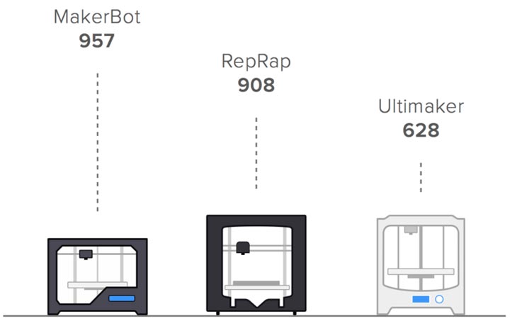 Les modèles les plus répandus sont ceux de chez MakerBot avec près de mille machines, des RepRap et des Ultimaker.
