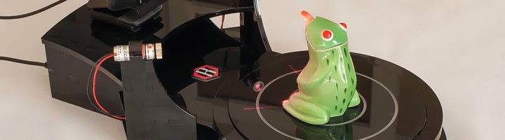 Le fonctionnement est assez trivial. Le scanner effectue 1600 clichés de l’objet à modéliser dans 800 positions grâce à un plateau tournant par pas de 0,45 degré pour obtenir une vue à 360°. Il y a donc deux photos par prise de vue, une avec 2 lasers et l’autre sans. Le logiciel se sert ensuite de ces deux images pour détecter la forme de l’objet et le modéliser avec sa texture en moins de 5 minutes !