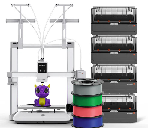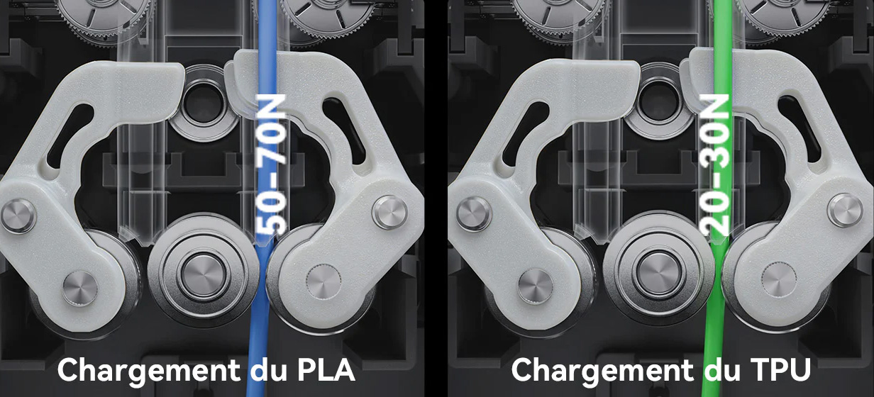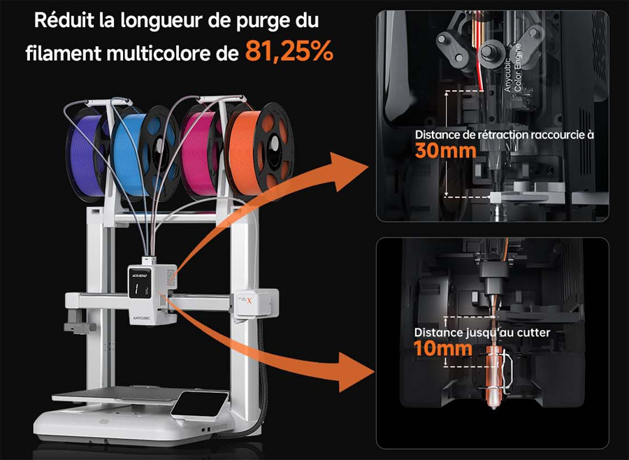 Outre cette tête d’impression novatrice chez Anycubic, la réduction drastique du gaspillage de filament est aussi un argument majeur : le chemin de transition a été réduit à seulement 30 mm pour diminuer les pertes de matière d’environ 80 % par rapport aux anciennes générations.
