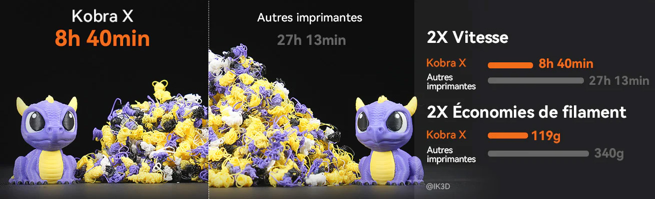 La Kobra 3 utilise un module ACE externe relié par plusieurs tubes (le ACE Pro) mais la Kobra X optimise ce chemin pour limiter les frottements et les risques de blocage. En termes de vitesse brute, les deux machines atteignent 600 mm/s mais la Kobra X gère mieux les accélérations grâce à un algorithme d’Input Shaping de nouvelle génération qui élimine les vibrations résiduelles.