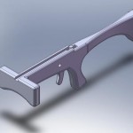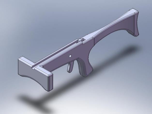 Elle est composée de trois pièces à imprimer (la crosse, la poignée et la gâchette) puis assembler à l’aide d’une vis. L’arc est quant à lui constitué d’une pince à cheveux coupée en 2 pour offrir flexion et résistance.