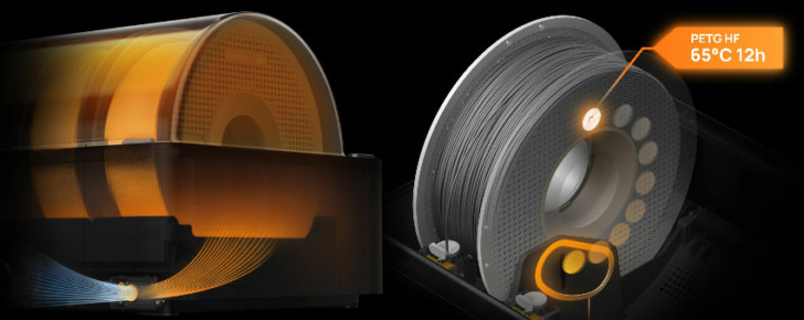 Les bobines tournent automatiquement dans l’AMS pour assurer un séchage homogène et un évent de ventilation facilite la déshumidification pendant l’opération.