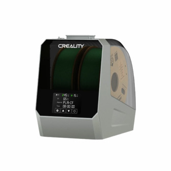 Le Dryer Creality Space Pi Plus peut abriter une ou deux bobines de 1 kg chacune. Ce boitier permet de chauffer à 360 degrés autour de la bobine grâce à un ventilateur interne. La température peut se configurer entre 45 et 70°C, pour une durée maximale de 48 heures et convient à douze types de matériaux : PLA, TPU, PP, ABS, ASA, PETG, PC, PA, PET, PLA-CF, PETG-CF et PA-CF.