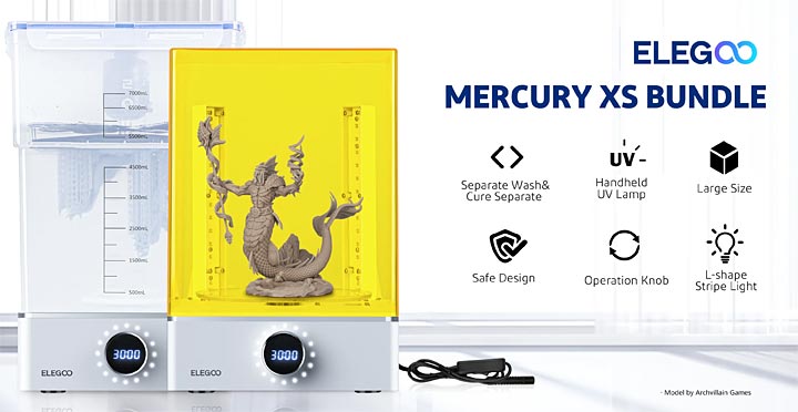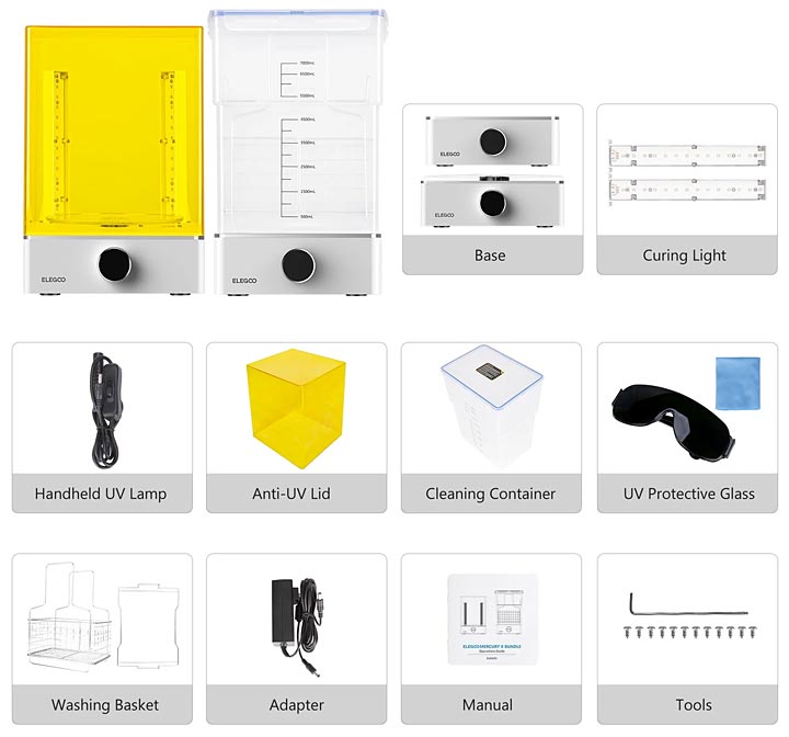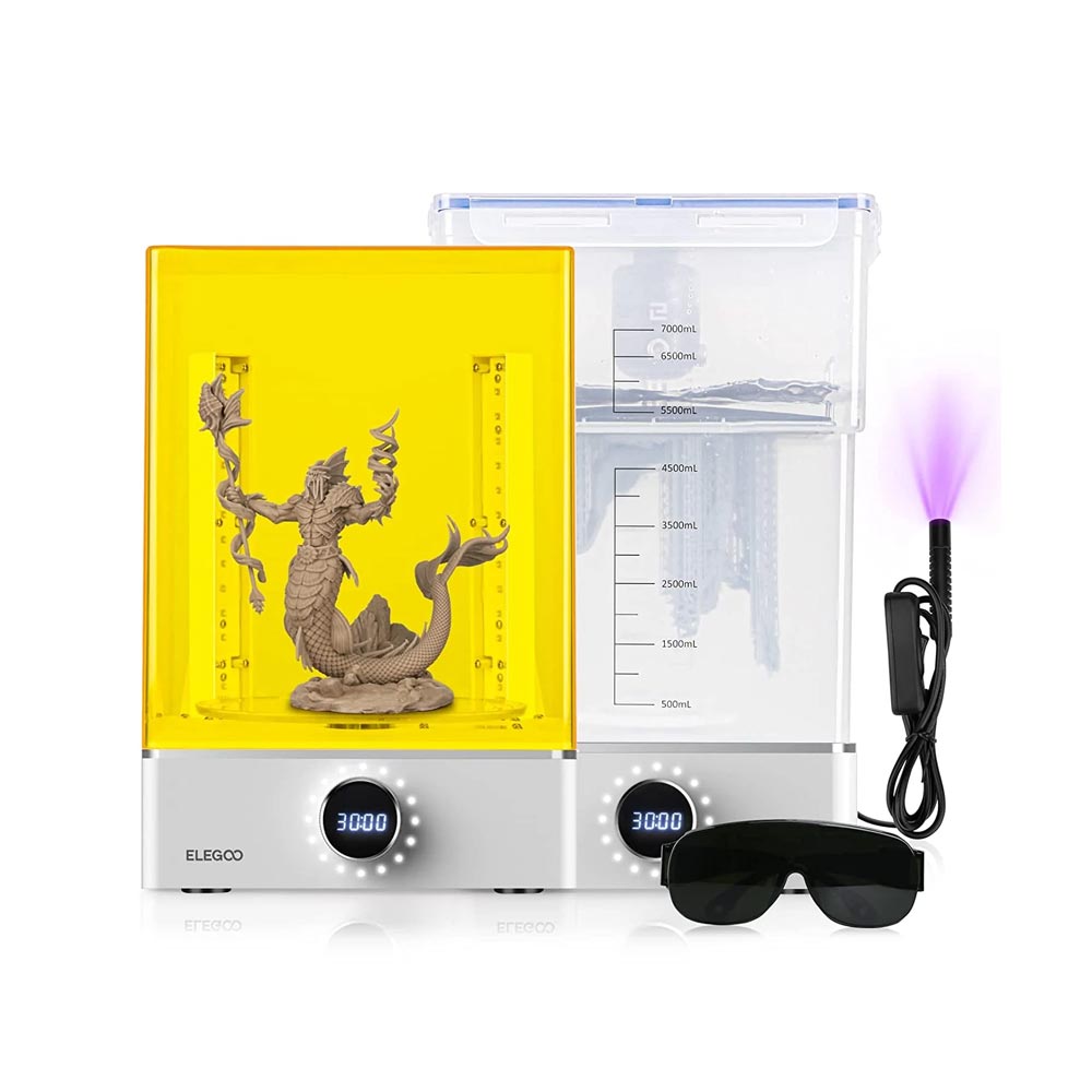 Le kit wash & cure Elegoo Mercury XS est une solution de post traitement pour imprimante 3D résine liquide, constituée de deux boitiers. L’un s’occupe de laver l’objet imprimé en stéréolithographie, l’autre va curer le print pour obtenir un résultat parfait. Il s’agit du complément idéal aux imprimantes 3D MSLA, comme la Elegoo Mars 3 Pro, la Mars 3 ou d’autres modèles du constructeur, mais aussi avec des produits concurrents tels que les Anycubic Photon M3 ou Creality Halot One.