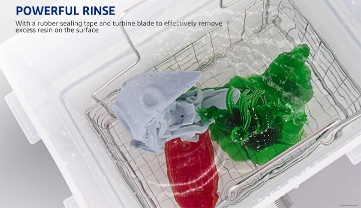 Le boitier de lavage a une capacité de 7,5 litres La station de curage utilise 14 lampes LED UV autour de l’objet et 4 sous le plateau tournant. En complément, une lampe de poche UV permet de polymériser la résine dans les moindres recoins. Un unique bouton de contrôle permet de régler la durée des opérations, de 1 à 30 minutes.