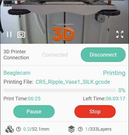 Dans sa version “Clean”, le fichier gcode est modifié pour faire un auto home de la tête d’impression avant chaque prise de vue de la Beagle. Le résultat est plus qualitatif qu’avec un appareil photo, un smartphone ou une GoPro où l’on verra les mouvements de l’extrudeur. Avec l’inconvénient d’une durée plus longue d’impression, la vidéo timelapse générée donnera l’impression que l’objet s’imprime tout seul.