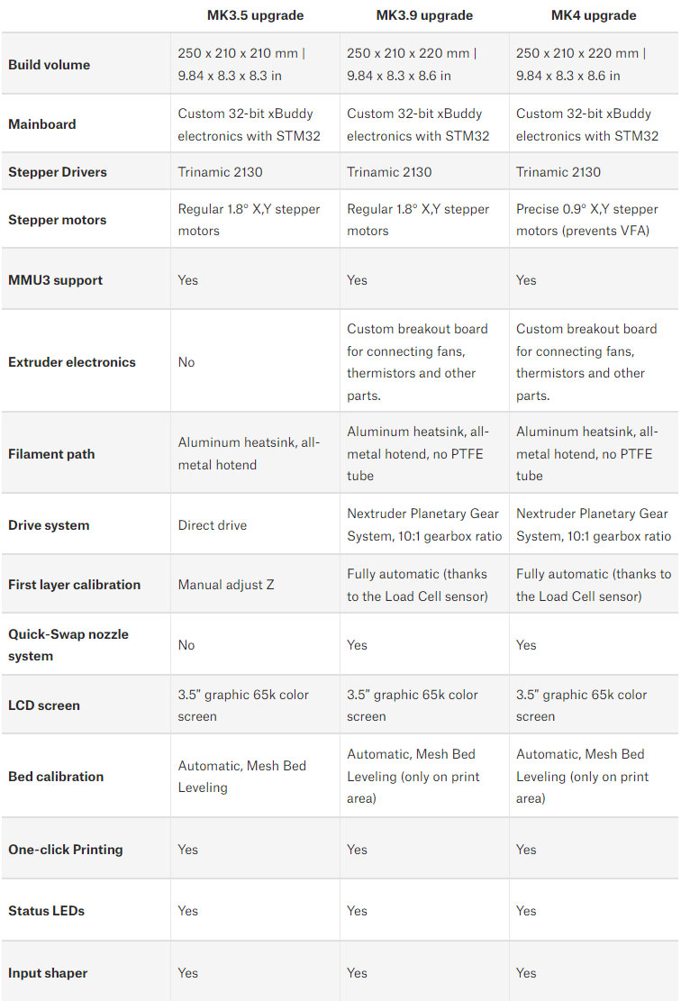 Tableau récapitulatif des upgrades MK3 vers Prusa MK4