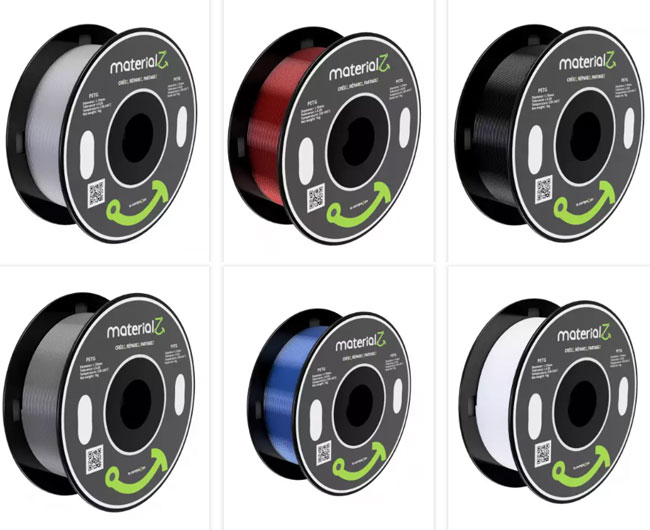 Le PETG MaterialZ existe en différents coloris : noir obsidienne, gris hématite, blanc sélénite, rouge rubis, bleu saphir et transparent quartz.
