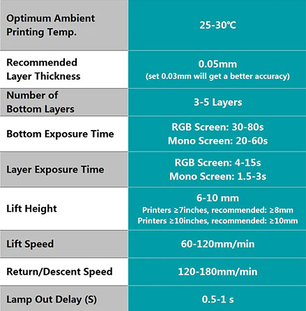 Les paramètres recommandés d’impression avec la résine Sunlu Standard Plus sont les suivants.