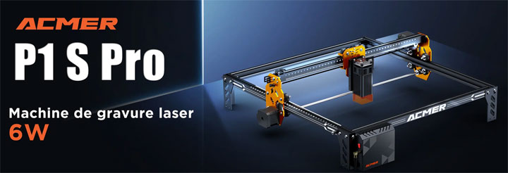 Le graveur laser Acmer P1 S Pro est équipé d’un module laser de 6W pour graver et découper. Il est certifié CE, FCC, RoHS et FDA. La surface de travail est de 380 x 370 mm avec une vitesse de gravure de 10 000 mm/min au plus rapide.