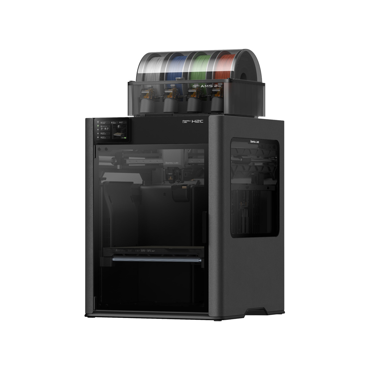 La H2C ayant 7 buses (6 dans le Vortek + 1 dans la tête d’impression double buses), elle doit être utilisée avec 2 AMS à 4 emplacements minimum (AMS ou AMS 2 Pro) pour en tirer le meilleur parti.