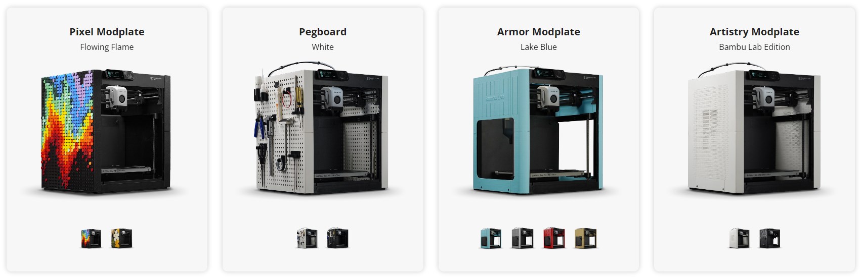 Grâce à différents “modplates”, les panneaux latéraux de la P1P peuvent être personnalisés. Les plus bricoleurs y mettront le modèle Pegboard afin de pouvoir accrocher des outils sur le panneau perforé. Les amateurs de design, qui préfèrent avoir une machine originale, opteront pour les modèles Pixel, Armor ou Artistry qui sont disponibles dans différentes couleurs.