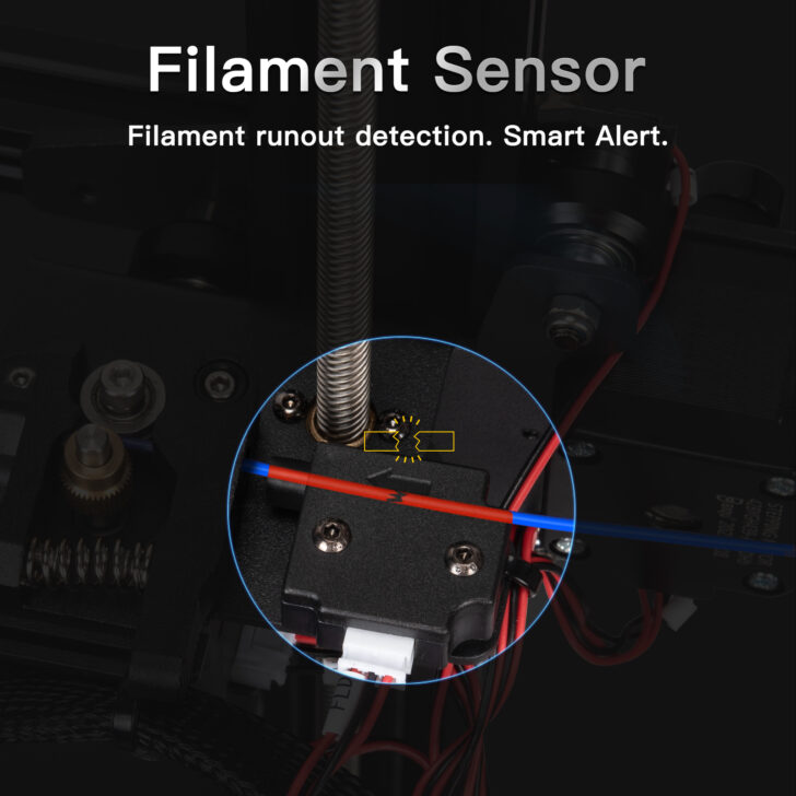 Afin de ne pas gâcher de plastique et de temps, en plus de la reprise sur panne de courant, un capteur de filament permet de mettre en pause l’impression en cas de pénurie de consommable.