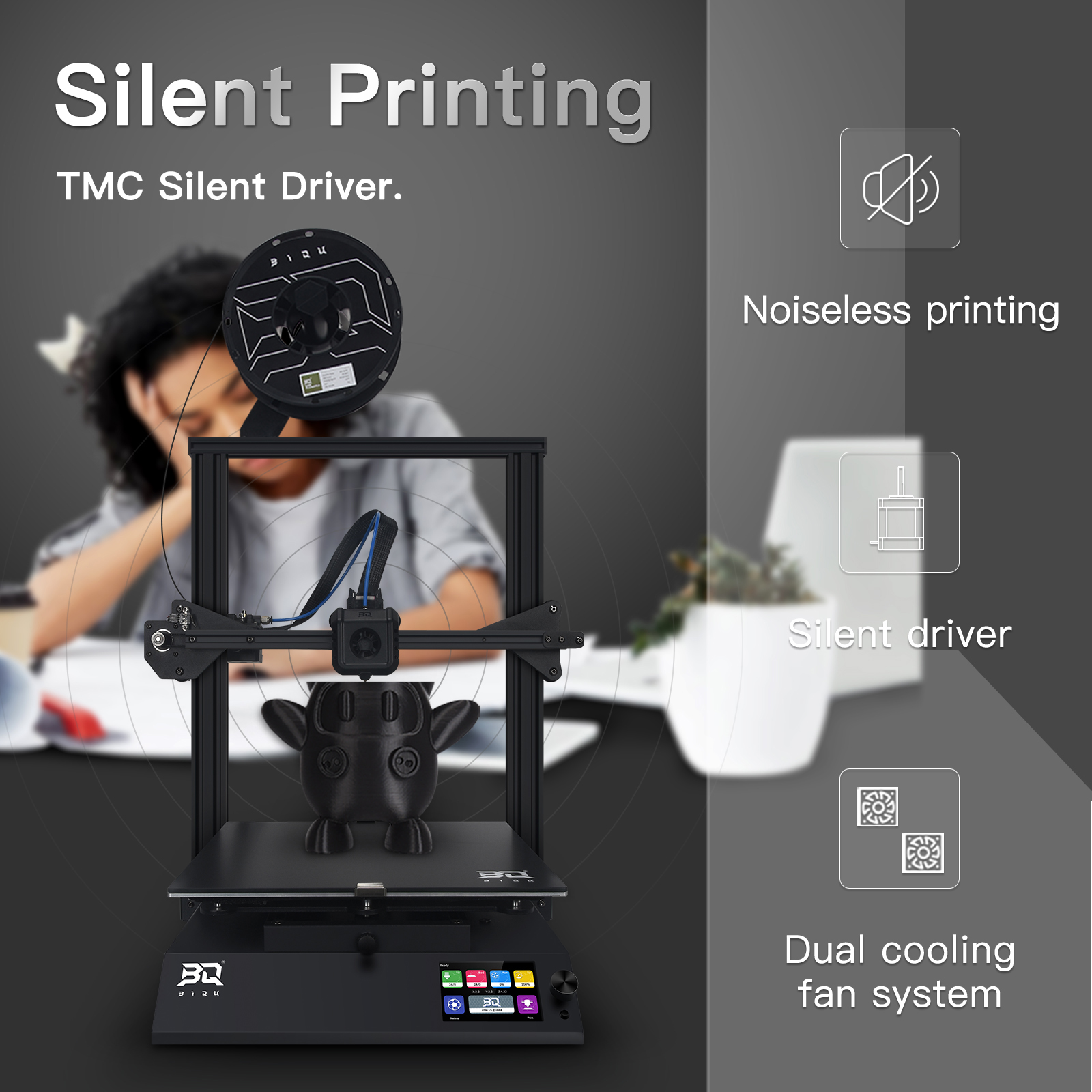 Au cœur de la B1 SE PLUS on retrouve une carte mère 32 bits propulsée par un processeur Cortex-M4. Les moteurs sont animés par des drivers silencieux et le tout est refroidi par 2 ventilateurs pour plus d’efficacité à vitesse (et nuisance) réduite.