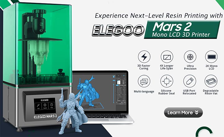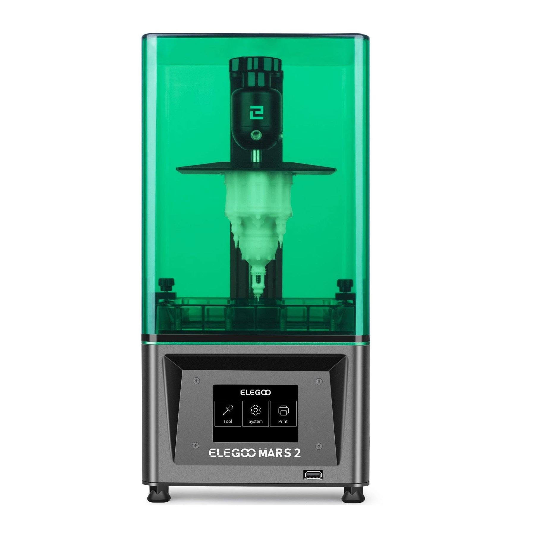 L’imprimante 3D SLA Elegoo Mars 2 succède à la Mars “tout court” dont voici le test en tant que Mono LCD MSLA (Masked SLA) qui utilise de la résine liquide, comme toute la gamme Elegoo Mars. Le volume de la Mars2 est de 129 x 80 x 150 mm, soit un peu plus que sa devancière. L’épaisseur de couche varie entre 10 et 200 microns, à une vitesse d’impression comprise entre 30 et 50 mm/s. La source de lumière est de type UV 405 nm, un écran 2K Monochrome LCD de 6,08 pouces (1620 x 2560 pixels).