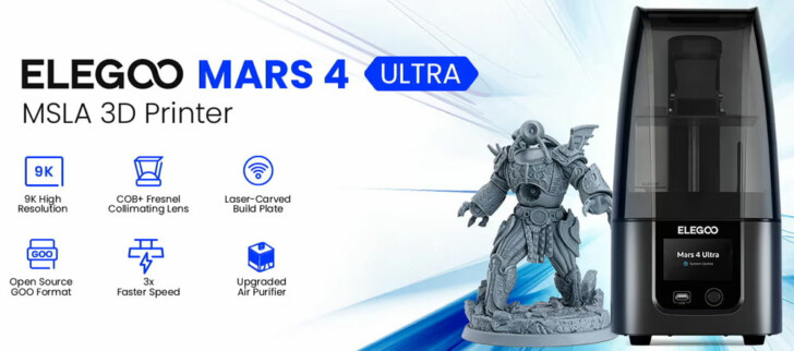 L’imprimante 3D Elegoo Mars 4 Ultra 9K est un modèle encore plus évolué que la Mars 4 9K, sortie en même temps en mai 2023, et diffère de la Mars 4 en technologie DLP. Elle embarque un écran monochrome de 7 pouces et de résolution 9K (8520 x 4320 pixels). Le volume maximal d’impression est de 153,36 x 77,76 x 165 mm.