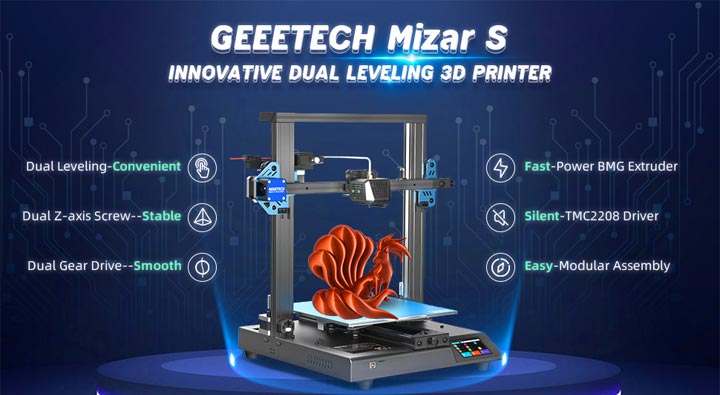 L’imprimante 3D Geeetech Mizar S est une FDM pour la maison avec ajustement automatique du plateau en neuf points de pression grâce à son ABL. La hauteur de couche démarre à 100 microns et la MizarS est compatible avec les filaments PLA, ABS, PETG, bois… L’extrudeur peut atteindre 250°C quand le plateau peut monter à 110°C.