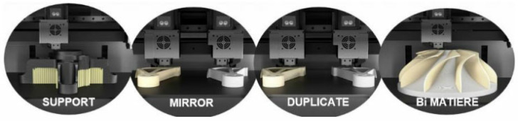 Les têtes IDEX permettent des impressions en mode miroir, duplication ou bi-matière sur un même objet, notamment pour l’utilisation de supports.