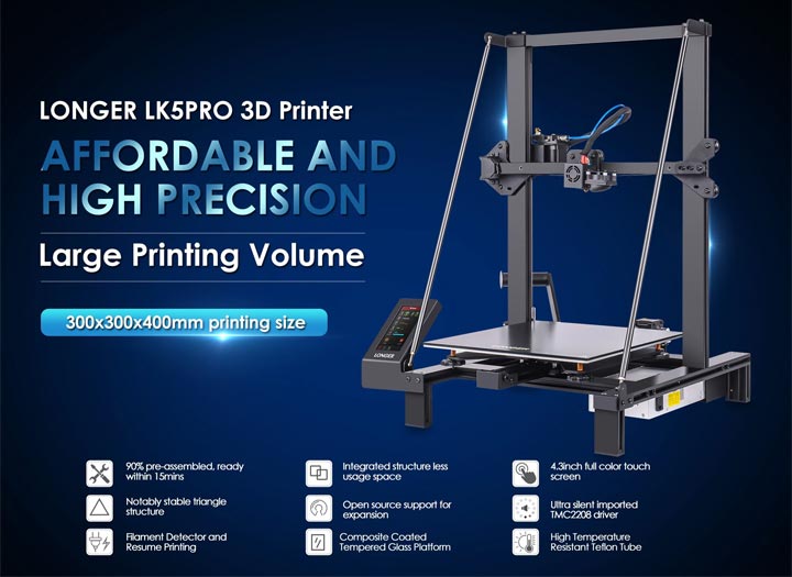 L’imprimante 3D Longer LK5 Pro fait partie de la même famille que les LK1, LK2, LK3, LK4 et LK4 Pro, dont vous retrouverez le test ici. Plus évoluée puisque sortie fin d’année 2020, la LK5Pro affiche un grand volume de 300 x 300 x 400 mm sur sa structure en triangle. Drivers TMC2208 pour un fonctionnement silencieux, carte mère open source, écran 4.3 pouces avec une interface moderne, capteurs de fin de filament et de coupure de courant, la LK5 Pro est une machine au goût du jour. Pré-assemblée à 90%, le constructeur annonce un temps de montagne d’environ 15 minutes grâce au tutoriel vidéo et au mode d’emploi papier.