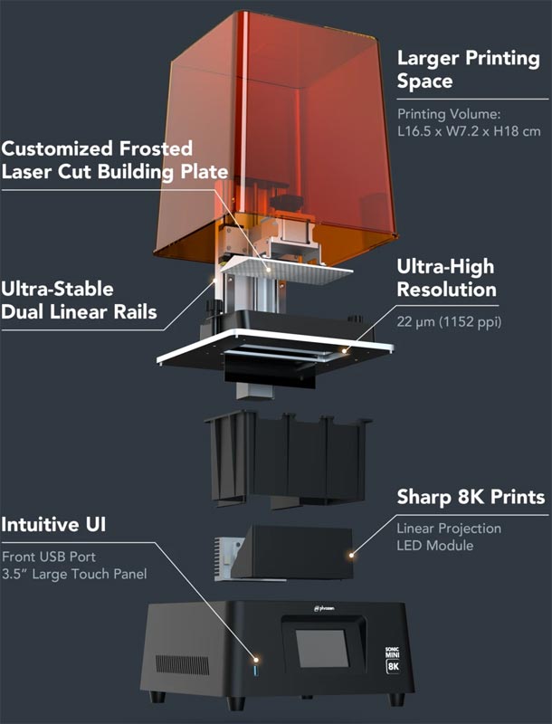 La vitesse d’impression de la Phrozen Sonic Mini 8K est de 80 mm par heure au plus rapide. Son double rail linéaire assure des impressions stables et de très bonne qualité.