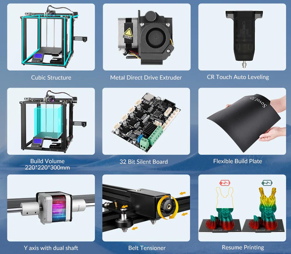 L’imprimante 3D Sovol SV05 est de type CoreXY qui apporte une stabilité supplémentaire à la machine. Son volume d’impression est de 220 x 220 x 300 mm avec auto leveling et Direct Drive.