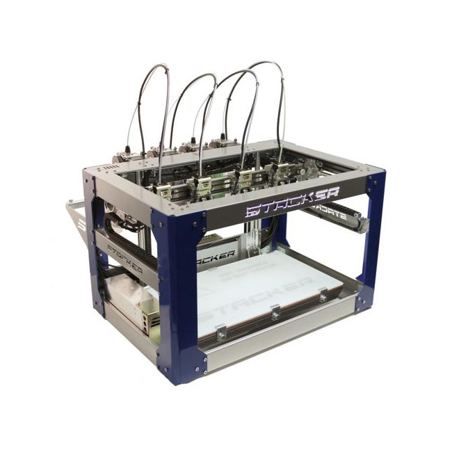 L’imprimante 3D Stacker 500S est la première machine à 4 extrudeurs du constructeur américain. Livrée avec 4 buses de 0.50 mm, la 500 est aussi compatible avec des 0.40, 0.80 et 1.00 mm. Le volume maximal d’impression st de 250 x 450 x 220 mm, selon le nombre d’extrudeurs utilisés. La résolution d’impression peut être configurée entre 100 microns et 1 mm avec une vitesse allant jusqu’à 150 mm/s.