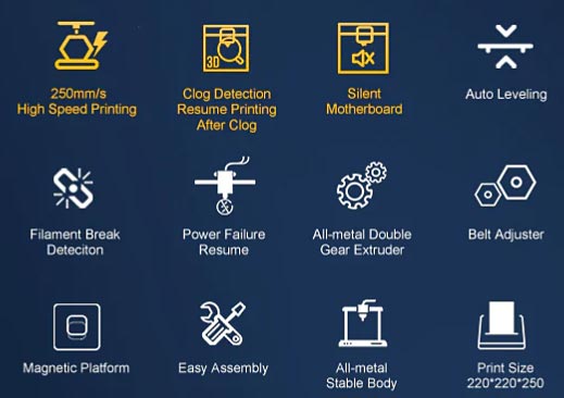 L’extrudeur à double engrenage peut atteindre la température de 260°C, la rendant compatible avec les filaments PLA, PLA+, ABS, PETG, HIPS, PCL, TPU. Un auto leveling 3D Touch en seize points s’occupe de vérifier la planéité du plateau chauffant. Des capteurs permettent de mettre l’impression en pause en cas de coupure de courant ou de pénurie de filament.
