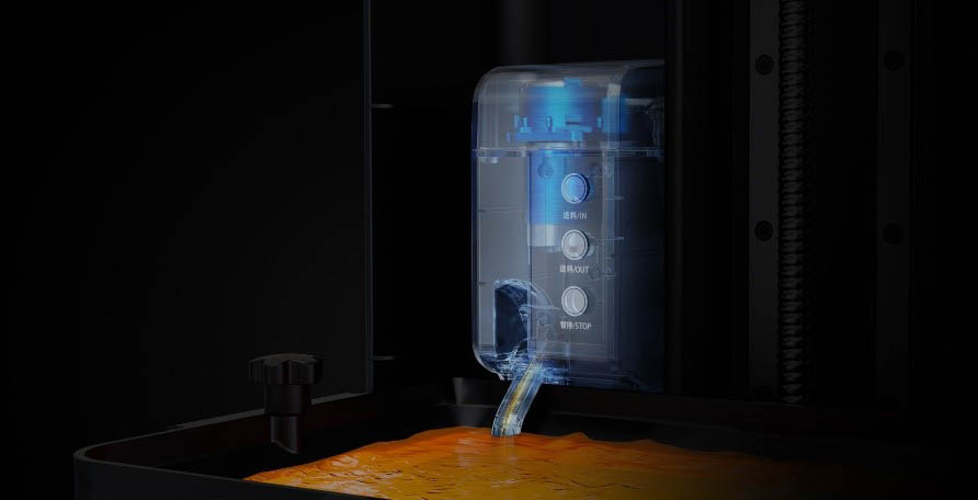 Pour les makers qui solidifient des litres et des litres de résine, la Mage Pro dispose d’une pompe “intelligente” de remplissage et vidage du bac de résine liquide (à raison d’un litre par heure) qui rappelle le système que nous avions grandement apprécié sur la Formlabs Form 3 !