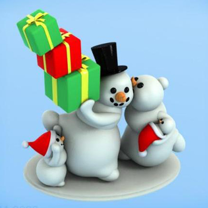Mignonne petite figurine avec des bonhommes de neige qui portent des cadeaux à mettre au pied du sapin.