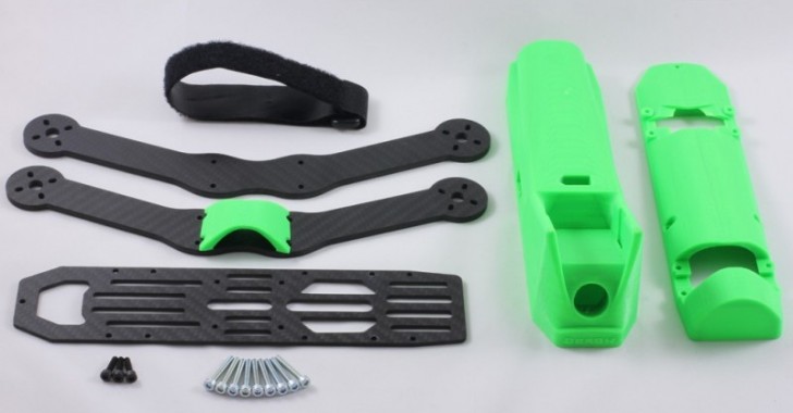 Cette “frame” n’est par contre pas donnée puisqu’elle est vendue 179 € sur le site de DR-buddy. Il s’agit d’un kit à monter comprenant les bras avants et arrières, la plaque centrale, les 2 coques, la visserie nécessaire au montage ainsi que 2 sangles (une pour la caméra HD et l’autre pour la batterie) et une PDB (plaque de distribution de courant) OSD PRO. A cela il faut ajouter les hélices, les moteurs, l’électronique, une batterie (4S conseillé), le matos FPV, la caméra HD (optionnelle) et la filasse / connecteurs pour relier le tout.