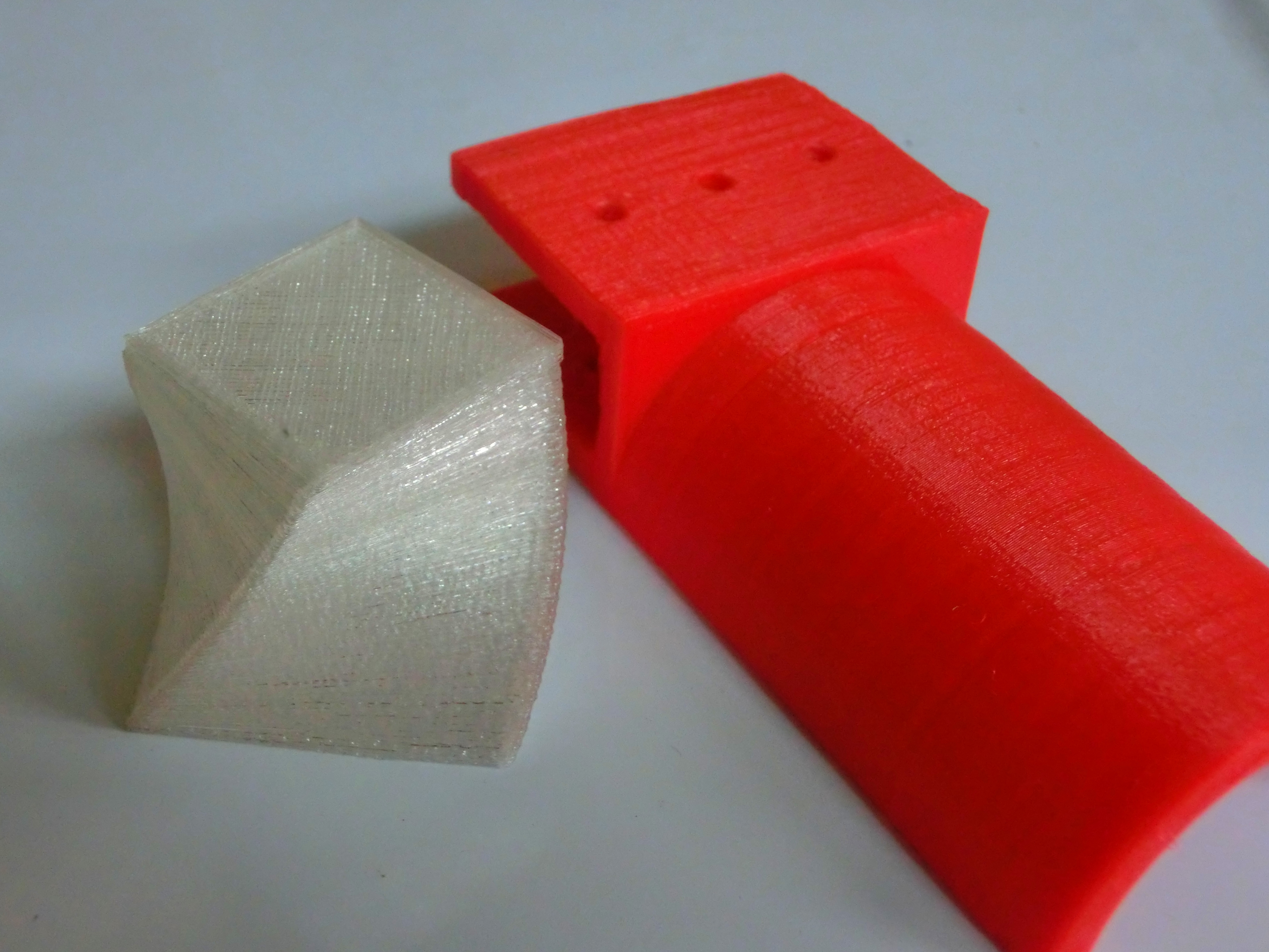 Nous retrouvons la pièce en Filo3D à gauche. Cela n’est peut-être pas flagrant sur les photos, mais les surfaces visibles de cette pièce sont très lisses et précises : on ne retrouve pas de petits paquets de filament extrudé formant une surface moins uniforme comme avec l’autre PLA. Sa couleur est très vive en comparaison à la majorité des autres PLA standards dont les couleurs sont beaucoup plus ternes.