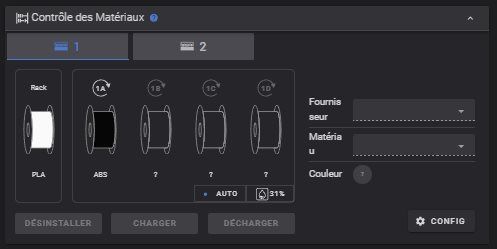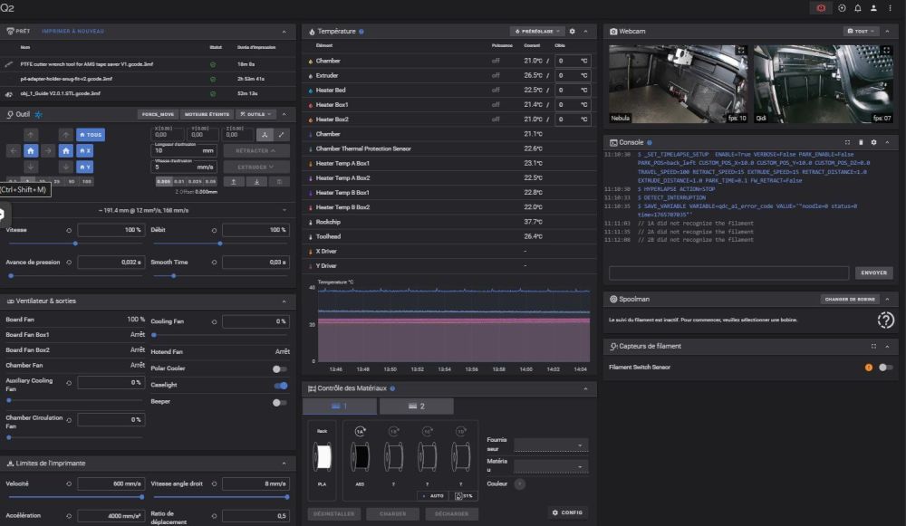 Pour le moment, pour vérifier que deux Qbox sont bien gérées, je n'utilise que deux voies (sur les quatre) de chaque boitier… c'est fonctionnel , mais quelle usine à gaz au niveau des PTFE. L'écran affiche bien les deux boitiers, idem pour Fluidd :