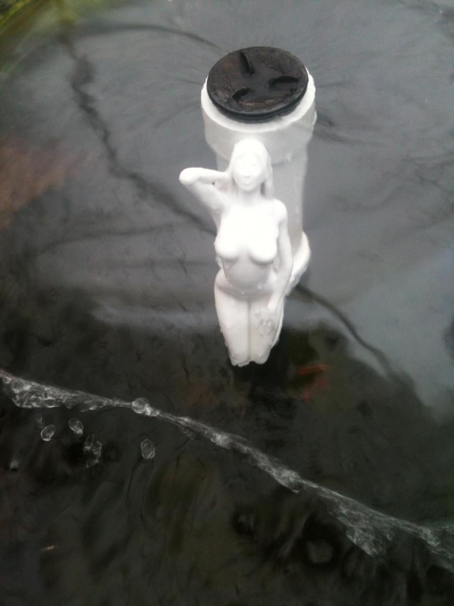 une petite nana qui sert de décoration pour une fontaine , elle a son petit succes dans le bassin , même les poissons rouges viennent la titiller !!