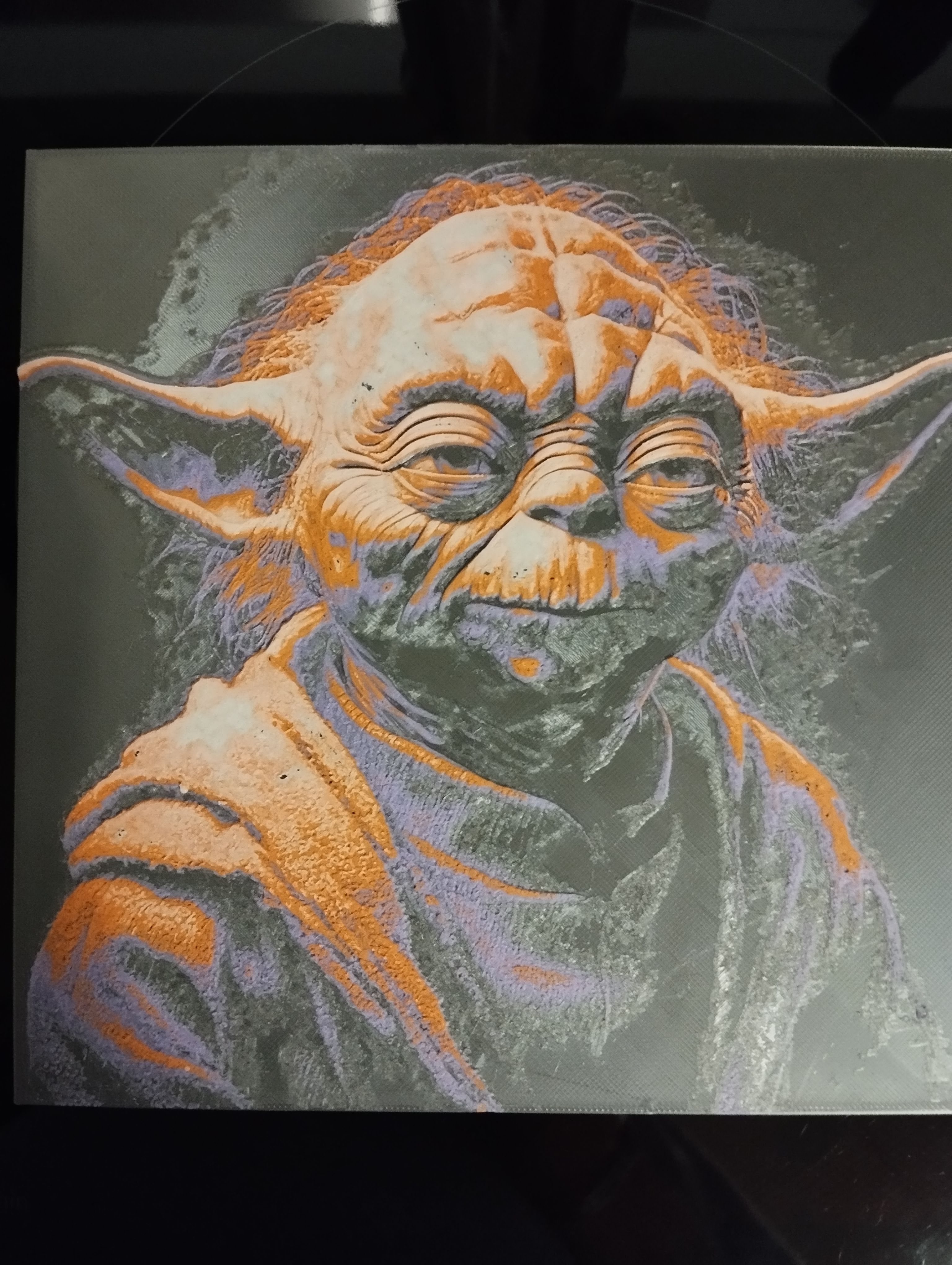 Imprimé sur Two Trees SK1 en 4 couleurs Pla Silk noir, Pla eco violet, Pla eco orange, Pla eco blanc, le tout de chez ArianePlast, température 220° et 60° en 5h29 à 200 mm/s et le model est  YodaHueforge, première couche en 0.16 et la suite en 0.08