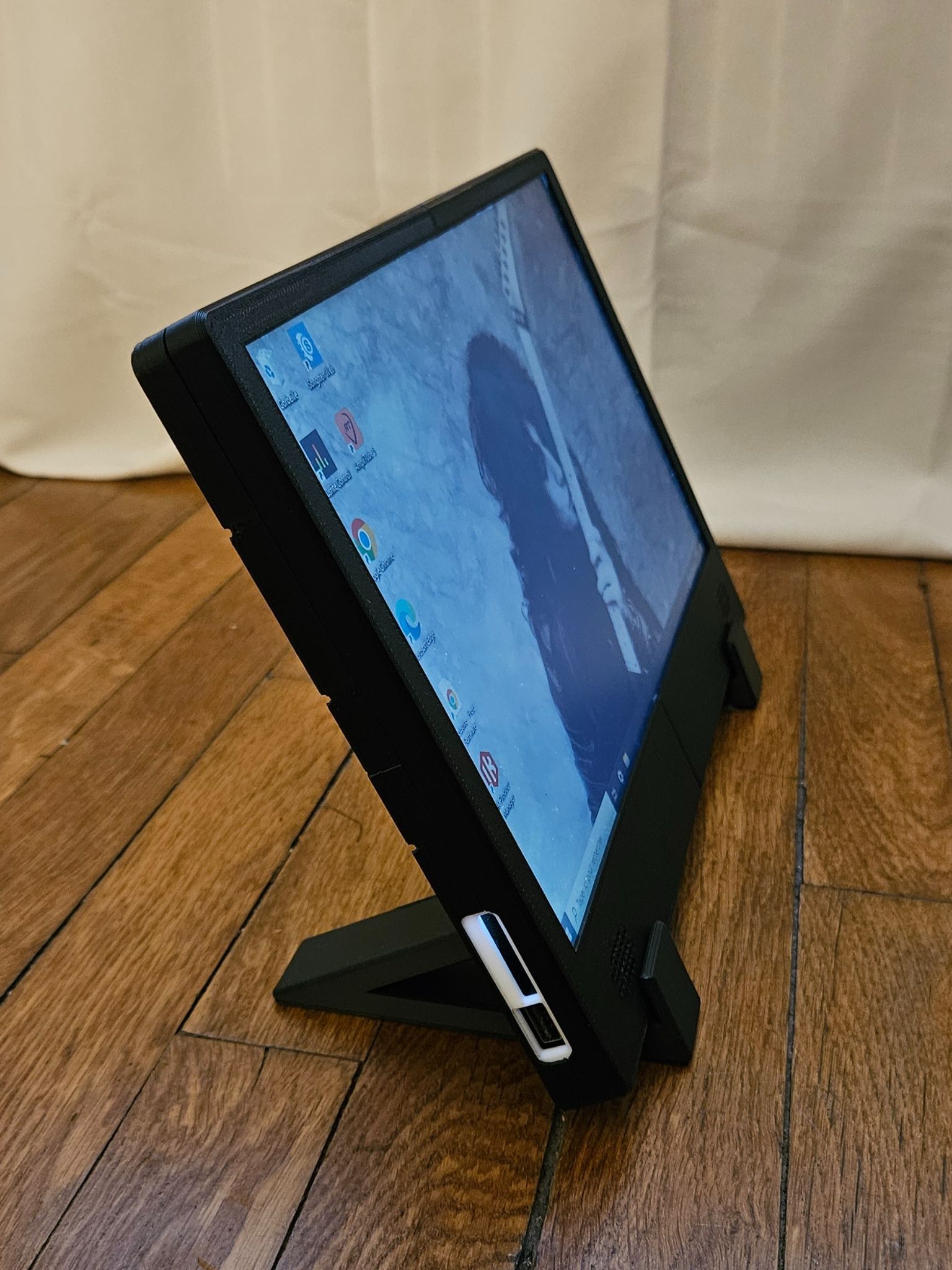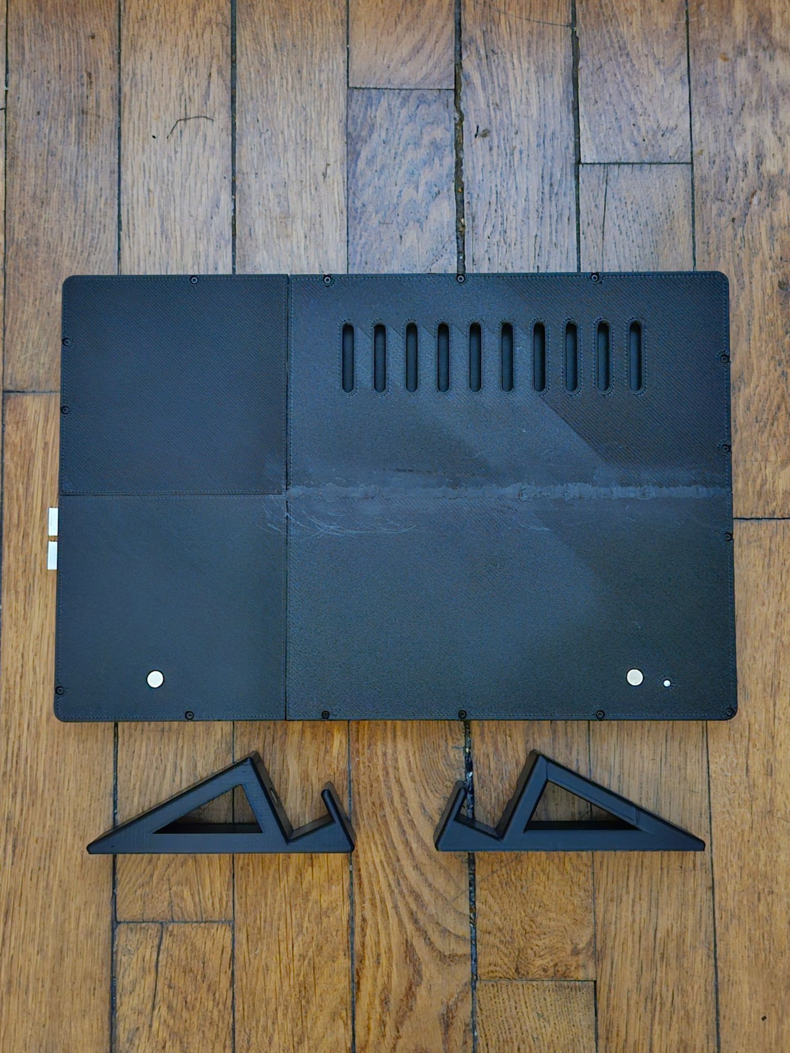 Bonjour à tous, Je viens de finir un petit projet et je me suis dit que ça pourrait donner des idées à certains Je voulais avoir un petit PC "fixe" uniquement dédié à ma pratique de la guitare que je pourrais laisser sur mon bureau, et j'avais sous la main les composant de mon ancien PC, un petit HP pas très puissant. Le châssis en plastique n'avait pas fait long feu, comme sur presque tous les PC assez bas de gamme, mais les composants étant toujours bons alors je me suis lancé : J'ai d'abord modélisé toutes les pièces de la carte-mère en prenant les cotes au pied à coulisse, mais j'ai finalement recommencé de A à Z car ce n'est pas précis sur de grandes pièces. J'ai alors scanné la carte mère, et j'ai recréé les esquisses par dessus. C'était la première fois que j'utilisais cette technique, et c'est très simple et relativement précis. Le PC fonctionne très bien, n'ayant seulement que l'écran, la batterie et la carte-mère, j'ai dû acheter la souris et le clavier qui vont avec. Le bouton d'allumage est derrière, c'est le pin blanc à droite de l'aimant sur la prochaine photo. Le seul problème est dû aux aimants qui servent à maintenir les supports, car ils sont trop proche du capteur à effet hall et quand ont les mets en position l'écran s'éteint car le système pense que le capot est refermé, pas très grave je bouge juste de 5mm les supports. Le PC fait 21mm d'épaisseur, un peu épais mais difficile de faire une conception robuste en affinant trop les paroies. J'ai pas grand chose de plus à ajouter, c'était simplement pour montrer comment redonner gratuitement (ou pour 15euros / clavier+souris) vie à un vieux PC Si vous avez des questions n'hésitez pas8 points