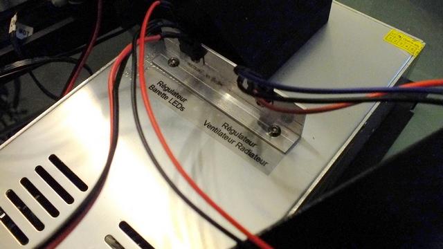 Alors pour les régulateurs, voici ce que j'ai fait (il m'en a fallu deux, un pour l'éclairage du plateau, et un pour le ventilo Cooltek. Les deux sont montés sur une cornière de 80mm de long Mon branchement est un peu merdique au niveau des couleurs, car sur le faisceau d'origine, le ventilo est alimenté par des câbles jaune (+) et bleu (-), et j'avais pas de jaune ! Mais ça reste lisible. Pour la barette, l'alim 24 vient direct des bornes libres sur le boitier. Le seul point litigieux est que les deux masses (pin central des régul) doivent alimenter 3 éléments: fil d'arrivée, fil de départ et régulateur1 point