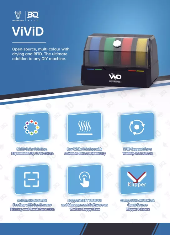 Finalement, le boitier multifilament (Vivid) devrait être dévoilé le 17/11/2025, livraisons Q1 2026. Compatible avec les imprimantes Klipper, HappyHare serait directement utilisable en plus de la solution Biqu / Bigtreetech. Voir afficher le terme Open source me ravit , il faudra juste que BTT complète son site de documentation et/ou un dépôt Github. Source Biqu4 points