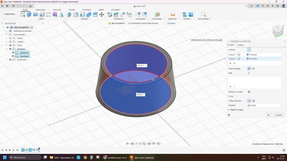 en fait il y a erreur sur la fonction lissage solide, il ne faut pas faire coque esquisse1 dans plan xy cercle diametre base + decalage epaisseur, fermer esquisse construire plan de decalage : distance= hauteur H du cone, sur ce plan créer esquisse2 cercle diametre haut puis decalage epaisseur, fermer mode solide : lissage 1 en reliant les 2 cercles externes, on obtient un cone "plein" puis lissage2 entre les cercles internes COUPER, et voilà1 point
