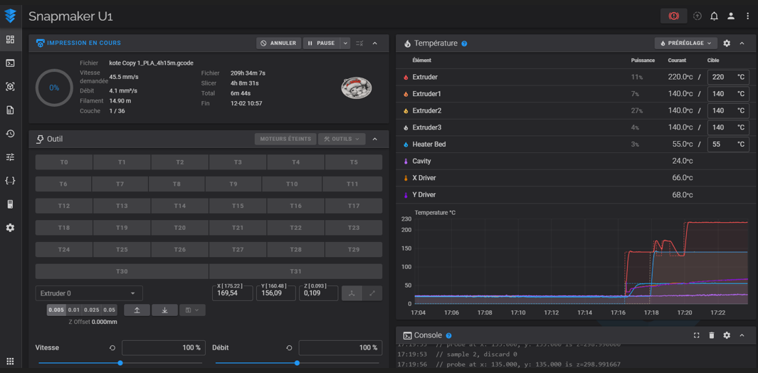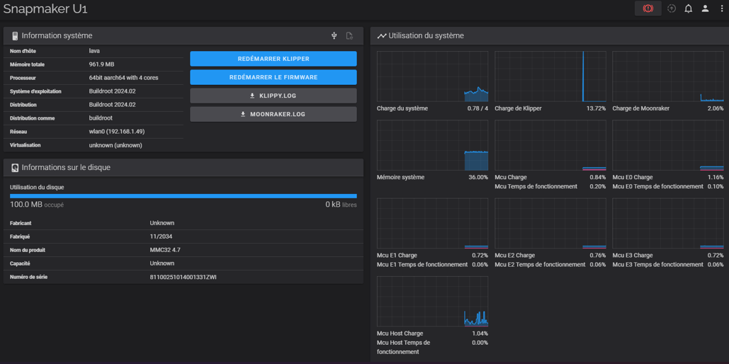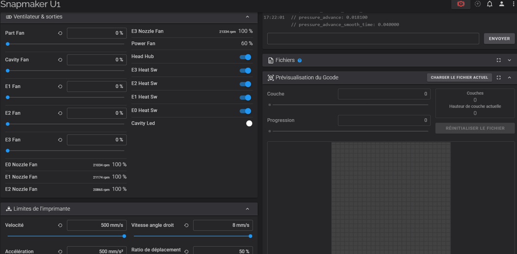 J'ai reçu ce jour ma Snapmaker U1 faisait patie du premier batch de livraison pour les backer du Kickstarter, la U1 etant tellement prometteuse sur papier que j'ai pas résisté et j'ai sortie la CB en Aout pour la commander. Livraison du Colis par DPD ce n'est pas la société de livraison que je préfère mais tout c'est bien passer, la machine est très bien emballer et le guide rapide est directement présent sur le dessus. étant donné que cette journée est aussi mon anniversaire je ne commencerais les test et le montage que Samedi car autant prendre des photos voir vidéo au calme. Je m'arrête donc la pour ce soir mais je reviens le plus vite possible pour commencé à vous remonter des infos impressions de la machine et photos. Alors le montage est très simple et bien documenté dans le guide rapide en couleur très belle qualité et multi-lingue, suivez bien les étapes dans l'ordre et tous ira bien, petit conseil quand même lors de phase de re-tension des courroies ne resserrer pas trop les vis une fois la procédure faite, et avant de démarrer l'imprimante la premier fois place manuellement la tête bien dans le coin avant gauche sinon vous risquez d'avoir une erreur lors des contrôles et calibration initial ;). Je mettrais plus de photo de l'imprimante lors de la phase de montage sur l'article du test, mais voici la machine assemblé. Bon alors Premier retour à chaud l'imprimante imprime vraiment super bien sur mon premier test, qui est le petit dragon 4 couleur proposer en test par Snapmaker sur la U1, celui ci imprimer avec les 4 bobines de PLA RFID SnapSpeed de 500gr. Voici bon le résultat de la première impression qui est en couche de 0.2mm. Maintenant a savoir le firmware d'origine en v0.8 contient des bug sur l'appairage cloud (SanpOrca et Appli mobile) et les communication Wifi pour résoudre ce soucis je vous invite a vous rendre sur le site Snapmaker prendre le dernier firmware en V0.9 le placer sur un clé USB et demande une MaJ manuelle en local, ceci va mettre a jour le firmware et après le soucis est réglé, je ne sais par contre si cela résout la soucis de MaJ en OTA par la même faudra attendre la prochaine MaJ pour être sur mais je pense que oui. Ensuite SnapOrca est pas trop mal mais il comporte encore des bug dont une lenteur importante lors du tranchage d'une pièce multi-color, j'en aurais plus a dire après des test plus approfondit Les test du jours sur différrents pièces multi color importer ou paint via SnapOrca ce sont soldé par un echec lors du changement de tête, ceci n'est pas réellement lié a l'imprimante mais au Slicer. Cette erreur est référence comme une commande incomprise par l'analyse de Klipper qui résulte en a echec direct de l'impression. Exemple d'un chat noir avec écharpe de noël rouge et bonnet qui a planté lors du changement de tête. La faute est situé ici, les valeurs de pressure advance ne sont pas fourni avec des valeurs valide En réalité le soucis est simple les valeurs doivent être exprimer avec un . et pas une virgule comme séparateur décimal, ce souci après vérif ne semble concerné que le système Windows et pas Mac OS ou Linux, en effet les paramètres régionaux sont utilisés ici et par defaut en EU nous utilisons la , et pas le . comme séparateur décimal Donc il faut aller faire un tour ici et apporté la modification C'est un soucis qui existait il y a 1 ans environs sur Orca Slicer et corriger depuis longtemps mais qui est présent sur le slicer SnapOrca actuel. Cela ma fait perdre du temps de test aujourd'hui, mais c'est le seule réel souci rencontré pour le moment ---------------- Interface de la U1 ----------------------------- Malgré un écran TFT de petit format de 3.5" l'écran reste plaisant a utilisé suffisamment réactif et ergonomique, a noté cependant que nous avons accès qu'a 2 langues pour le moment a savoir Chinois ou Anglais. Ce TFT a un format carré ce qui lui permet de présenté suffisamment d'information par page (sachant que certaines pages sont scrollable verticalement), et la réactivité et plutôt bonne je m'attendais a bien pire que cela. La page d'accueil affiche les bobine installé dans les tête et les infos de base, le premier menu de réglage regroupe les contrôles la gestion des tête et les mouvement des axes. Le menu paramètre, permet de retrouver les menu de d'information système de vérification de MaJ en OTA ou manuel, et la gestion du réseau entre autre, le Réseau est en Wifi 2.4Ghz ici pas de 5Ghz disponible par contre chose intéressante pour certain nous avons la possibilité de fonction en mode Lan dans ce cas l'imprimante est en mode local uniquement disponible uniquement via le réseau local et les fonctions cloud sont désactivés. -------------------- Interfaçage Fluidd ---------------------------- La U1 étant sous Klipper j'ai voulu faire un tour sur l'interface Fluidd de la machine histoire de voir ce que l'on y trouve. La page d'accueil regroupe les infos classique mais l'on remarque quand même quelques subtilités comme la présent des temp° 4 extrudeurs, du bed, du caisson (cavity, enfin c'est ce que je pense j'ai pas encore vérifié) et des driver X et Y côté maillage de plateau on ce rend compte qu'il y des ajustements a faire, j'ai actuellement un Range 0.506 qui mériterait un ajustement des angle, mais a leur décharge si je prend la Creality K2+ j'avais un Range de 0.756 de base et pire encore sur la M1 Pro ou j'etais a 2.120 de base. Côté architecture on est sur un MCU ARM 64bit 4 core épauler par 1Gb de ram système pour faire tourner le Klipper par contre nous n'avons pas d'infos sur la capacité disque du système il me faudra partir faire un tour en SSH pour en apprendre plus. --------------------- Slicer ------------------------ Côté trancheur on est sur la version snapmaker de Orca utilisation assez classique si n'est que l'on retrouve 4 onglets Buses de 1 a 4 permettant d'indiquer la taille de bus