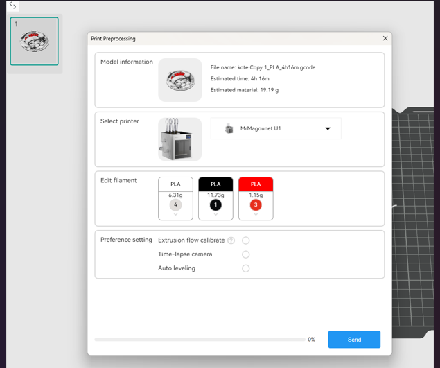je voudrais bien te le fournir mais on a que le Gcode dans la machine c'est le fichier test fournit pour les Dechet j'ai la tour d'amorçage. Le dragon fait 22gr de filament et la tour 20gr. Mais j'ai fait un Benchy 4 couleur je vous mettais les photos demain, Il a été nécessaire 27gr de filament au total benchy + tour avec la U1, j'ai fait une simulation sur ma A1 si on utilise le même benchy et même couleur en profile 0.2 de base on est à 157gr incluant benchy + Purge + tour, et si j'optimise sur la A1 Je peux espérer descendre a 104gr en benchy + Purge optimiser sans tour de nettoyage. Et surtout côté temps le Benchy sur la U1 a mis 1h51 sur la simulation sur la A1 on etait a 11h501 point