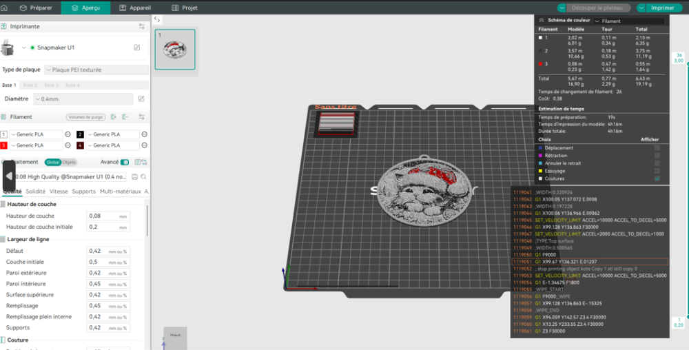 Je vais ici par la suite indiquer les modif ou mod ajouter a ma U1 et si il y a un réel plus. Le premier est un TopHat mis sur Thingiverse par Srin a première vue un utilisateur Coréen de la U1 son TopHat a l'air intéressant. Et surtout cela coutera bien moins que les 150€ en prix promo que celui officiel Snapmaker qui sera dispo que en mai qui plus est. Pour ceux qui chercherais a avoir un PTFE entre leur dryer de filament et le système d'envoi du filament au tête d'impression il y a un mod disponible Pour ma part j'ajouterais probablement une surface flexible Gyrogrip Pro Glacier pour U1, cette surface d'impression a déjà fait ces preuves et a 20€ environs y a pas ce priver Quelques rendu d'impression avec la U1. Attention il ne s'agit pas réellement d'une Hueforge ici car en réalité sur certaine couche nous avons plusieurs couleurs impression en 0.08mm avec le filament snapmaker. Chat colorisé sous SnapOrca en 0.2mm de hauteur de couche, rien de redire a la qualité d'impression toujours avec les profil Snapmaker . Attention on a une fausse impression qu'il y a des irrégularités de couches en réalité on perçoit pas a l'oeil c'est bien plus propre mais mon APN et la lumière exacerbe le rendu. Pour rappel sur la U1 on a 1h52min de temps d'impression pour 27gr utiliser Benchy + tour d'amorçage, en simulation sur la A1 on était a 11h50min de temps d'impression et 154gr avec les profile BBlab par defaut Benchy + tour + purge, et en optimisant on pouvait réduire à 104gr de filament en supprimant la tour et optimisant la purge pour un temps de plus de 11h30 toujours.1 point
