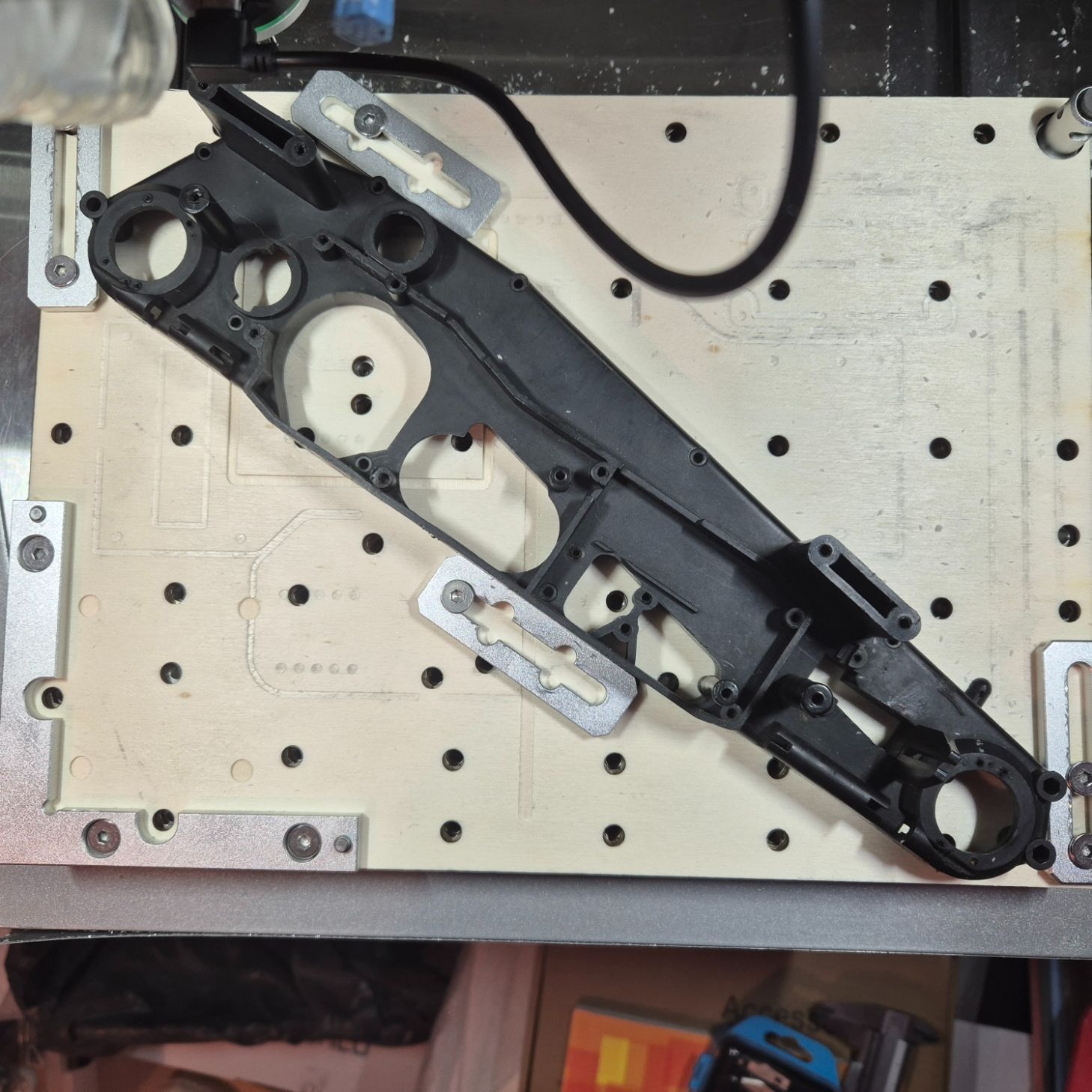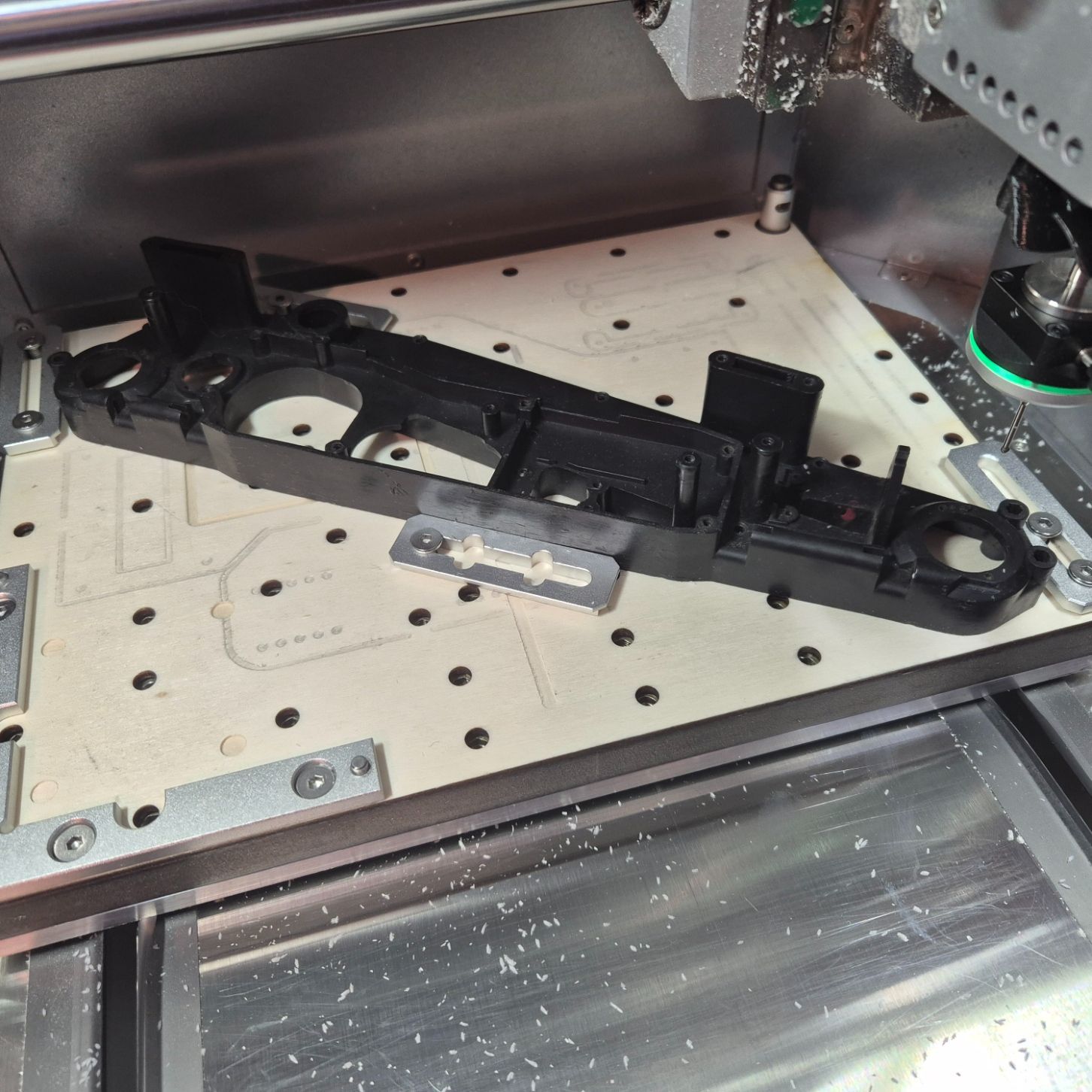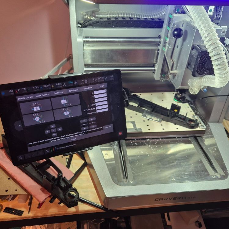 Le Mugen Mercury 4Xi a été un cauchemar à mesurer, ce qui a entraîné des divergences dans les dimensions. Il est trop long à mesurer, et il n'y a aucune pièce permettant de dériver correctement les mesures pour les demi-châssis. La numérisation 3D ne fonctionne pas bien avec les pièces noires. J'ai décidé de prendre une autre voie. La sonde 3 axes installée sur la Carvera Air grâce au community firmware/controller pourrait être très utile ici. Donc, l'approche est la suivante : - Le châssis est fixé sur la table de la CNC - J'ai décidé que mon axe de référence passerait le centre des cages de différentiel - J'ai sondé celui de l'arrière en utilisant la fonction de perçage de la sonde et j'ai défini mon origine de travail à partir de cela - J'ai sondé celui de l'avant en utilisant la fonction de perçage de la sonde et, en utilisant des maths simples et la trigonométrie, j'ai trouvé l'angle de l'axe entre les deux trous. - J'ai réglé la rotation du système de coordonnées de travail sur cet angle : X se déplace maintenant le long de l'axe défini et Y perpendiculairement à cet axe - Ensuite, je peux sonder n'importe quel trou/loge avec la géométrie définie / bossage/bloc avec la géométrie définie pour trouver le centre de chacun d'eux : il me suffit de noter les coordonnées affichées lorsque la sonde est ramenée au centre de l'élément sondé - Pour les bords, cela semble plus compliqué car les données doivent être notées en coordonnées absolues (comme fourni par l'interface de la sonde), ce qui signifie que je devrai les convertir dans le système de coordonnées de travail tourné. En résumé, c'est du travail, mais c'est vraiment prometteur... (et oui, j'ai dû utiliser les fonctions sinus, cosinus, tangente et arctangente, que je n'avais pas utilisées depuis la fin de mes études d'ingénieur )1 point