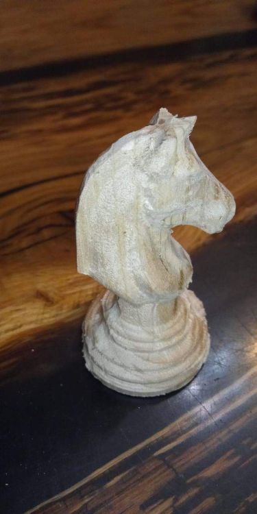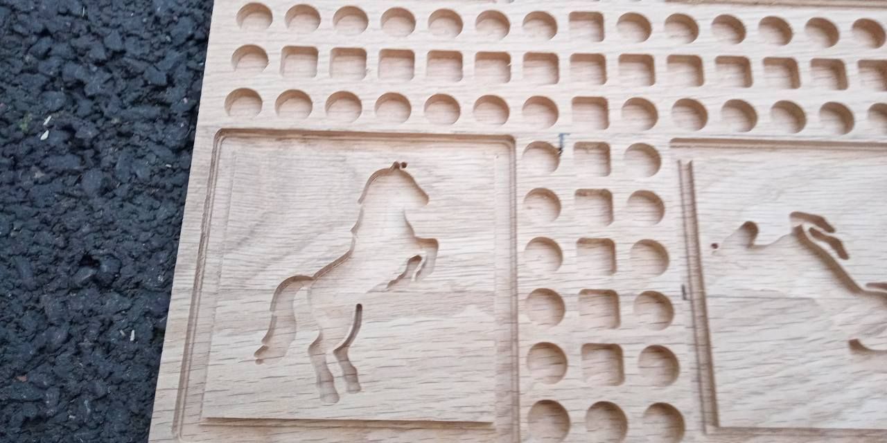 presque au 6eme ... mais j'ai un léger décalage encore , donc je pense que je vais ajouter des goujons et pas que 2 centrés sur l'axe. surtout que la je taff avec des rondins de chataignier que je découpe un peut. la je bataille avec le rotary reçu ce matin . 1er gros fichier fait, petit soucis avec la fraise de 6 mm qui a eu du mal a découper les cadres autours des chevaux. fraise de 6mm, la broche a du mal et quelque vibration décalage.1 point