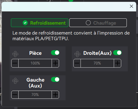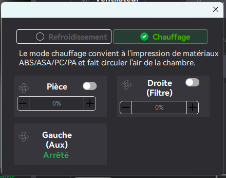 On reste dans les ventilateurs, j'ai acheté le ventilateur auxiliaire gauche pour la P2S, je l'ai reçu aujourd'hui et je l'ai installé dans la foulée, il n'y a rien de compliqué à part qu'il faut démonter la tôle arrière pour le brancher sur la carte mère, comme d'habitude tout est expliqué dans le Wiki de Bambu Lab, le ventilateur de 12W est livré avec trois vis de fixation et 4 morceaux de double face déjà collé sur l'arrière du carter Ce ventilateur est fait pour aider au refroidissement du plastique extrudé en complément du ventilateur droit, contrairement à celui ci il ne prend par l'air à l'extérieur de la machine mais à l'intérieur de la chambre Une fois installé il est automatiquement détecté pas la carte mère et il est possible de le contrôler via l'écran de la P2S et via l'interface web dans Bambu Studio En cour d'impression en mode refroidissement pour du PLA, PETG et TPU il tourne aussi vite que le ventilateur auxiliaire droit Par contre en mode chauffage pour de l'ABS, ASA etc... il est désactivé, il est impossible de le faire fonctionner1 point