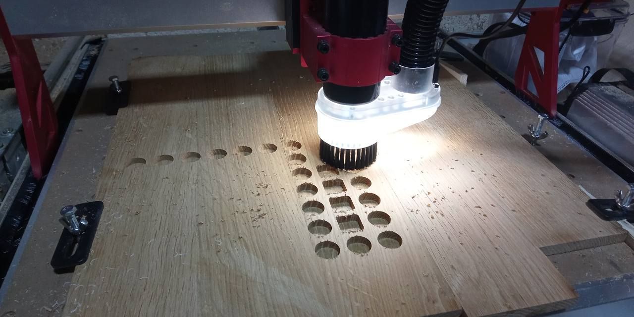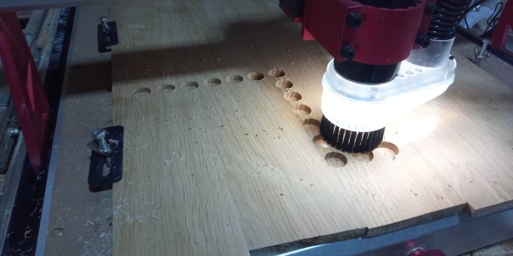 usinage du parcours fraise 6mm ( fraise spécial bois pour avoir moins de bavure) profondeur de passe 0.6mm , on pourrait faire plus mais mon plateau à surement quelque mm de variation recouvrement 2.5mm avance 900mm/min ( même si sur le papier on est limité a 800mm/ min je suis monté bien plus sans erreur et sans soucis , 1500 mm/min, surtout quand on usine comme cela en poche, moins de vitesse sur le Z, en 3D le Z à plus de mal a suivre quand on dépasse les 800mm/min) en mode gravure elle va beaucoup plus vite. plongée 250mm/min depuis que j'ai resserré l'axe Z , je n'ai pas eu de nouveau soucis de jeu ( au passage je suis pas le seul à avoir eu le soucis... je partage cela sur une groupe FB allemand, et cela a déjà dépanné 2/3 personnes qui on eu le même soucis.1 point
