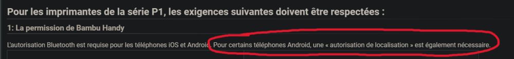 Je remonte un peu ce poste, hier changement de box donc faut remettre le wifi sur l'imprimante... J'essai avec le tel mais comme la première fois rien aucun appairage en bluetooth, j'ai bien vérifiée qu'il était activé sur le tel et dans l'application (l'application Handy à toutes les autorisations) mais rien... Donc je refait la manip avec la carte SD comme le première fois sauf que la ça marche plus Me voila bloqué car aucune autre solution pour mettre le wifi que ces 2 la.... Je réessaie plusieurs fois les 2 manip, je vérifie que je suis bien en 2.4GHz mais rien à faire, je fait une pose avant de tout cassée.... Je refait des recherche sur divers plateformes rien de bien concluent, je retourne sur le wikibambu et je fouille partout et la je tombe une petite ligne qui indique qu'il faut pour certains téléphones activer la location pour que le Bluetooth soit reconnu par l'imprimante.... https://wiki.bambulab.com/en/p1/troubleshooting/printer-binding-issue Perso j'aurai jamais penser à mettre le GPS en route sur le tel pour que le Bluethooth fonctionne avec l'imprimante mais au final ça a marché, par contre aucune idée de pourquoi ça ne fonctionne plus directement avec la carte (peut être une mise à jour du firmware qui a enlevée cette fonctionnalité).1 point