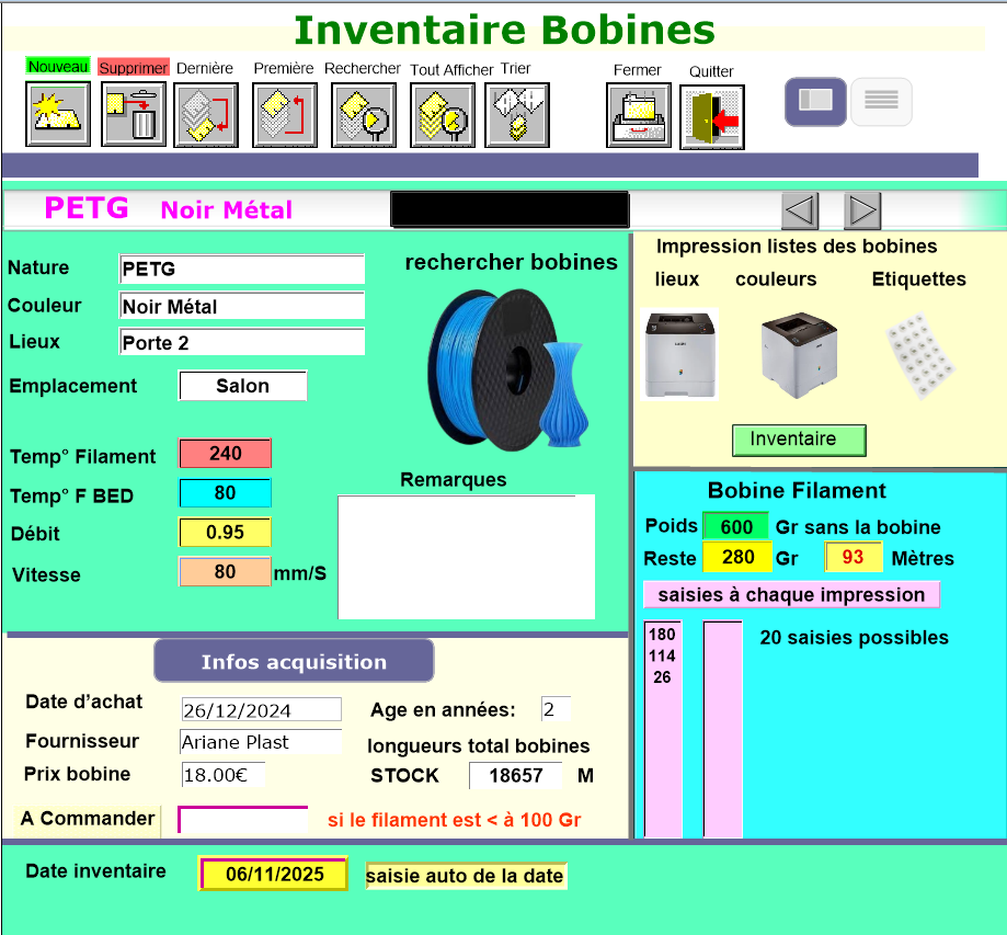 Bonjour à tous, Voici quelques améliorations de la BDD la gestion des bobines; j'ai rajouté quelques fonctions : - la possibilité de déduire à chaque impressions le poids des différents projets imprimés (20 lignes de commandes suffisent) - une allerte automatique avec un seuil mini de 100gr de filament pour éventuellement commander une nouvelle bobine. - le solde en mètres du filament restant après déductions des impressions réalisées - des paramètres des filaments pour une impression de qualité - un témoin optique pour visualiser la couleur du filament - des flèches de navigations pour scroller les différentes bobines (tri et recheches améliorées) - améliorations des listes avec différents TRI et sortie d'impressions au format PDF - mise en forme d'une sortie impressions d'étiquettes à coller sur la bobine ou le carton (pour situer le rangement) - possibilité de réaliser un inventaire précis avec date de saisie automatique - mise en forme des dates de saisies avec l'affichage d'un calendrier (plus facile et plus rapide pour la saisie) - une information sur l'âge de la bobine avec le nom du commerçant - une liste des bobines à commander projet en cours la saisie d'un QRCode avec édition d'étiquettes et ensuite la lecture avec le téléphone pour un inventaire et identification complète de la bobine. en résumé cette gestion me facilite bien la vie pour choisir une qualité de filament et la couleur. Cette BDD fonctionne sous Windows 11 et sur MAC mais je l'ai pas essayé a+3 points
