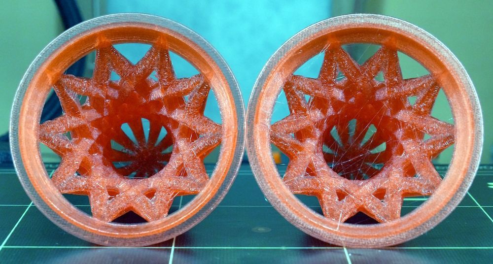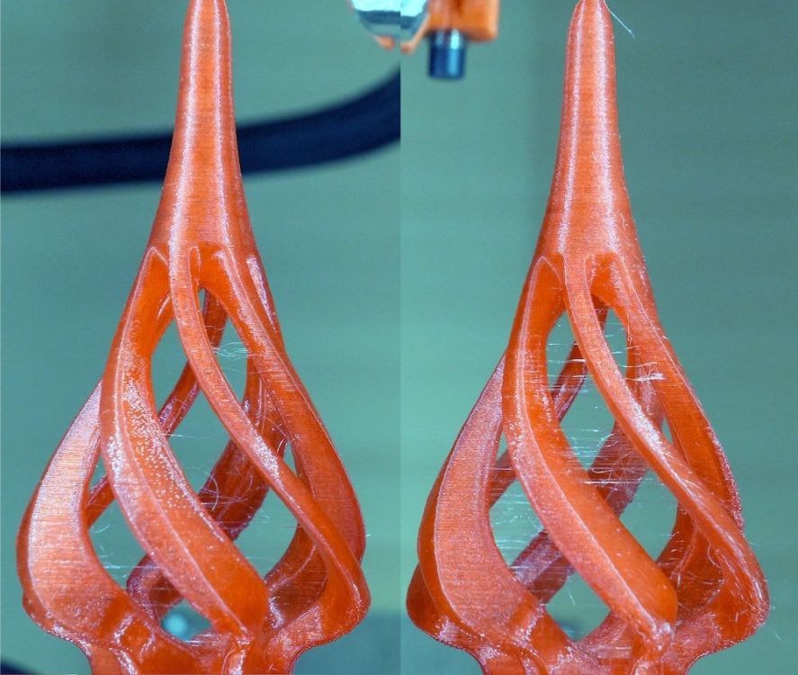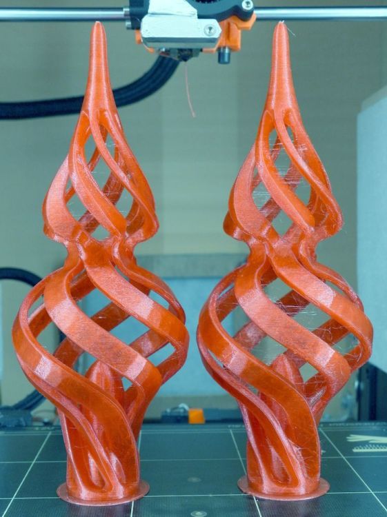 Bonjour, Je viens (enfin) de recevoir ma bobine de PVB rouge de chez SUNLU Je l'ai séchée à 50°C durant 8 heures. Le filament est bien sec. Je me dis que je n'avais pas séché assez longtemps le filament PVB transparent que j'avais utilisé pour les tests précédents... Je lance les impressions de Noël (ce sera pour la fin de l'année) - comme le filament PVB a tendance à faire du stringing, je fait une impression séquentielle (un objet après l'autre) : Je lance une 2e série de pièces. Et je me dis, tiens, on va comparer les deux, qui ont été imprimées à 24 heures d'intervalle, pour voir si durant ce laps de temps le filament a repris de l'humidité. La réponse est oui un peu, ça se voit car il y a plus de stringing, cependant l'impression reste très bonne. A gauche sur les photos, les pièces imprimées juste après le séchage - l'impression a durée 10 heures. A droite sur les photos, la deuxième série de pièce, imprimée 24 heures plus tard. NB : les couleurs sont bizarres car j'ai "poussé" les niveaux de telle sorte que les défauts ressortent bien. On peut voir aussi une différence de transparence sur le brim autour de la cloche, sur la dernière photo. Donc si on est très exigeant sur la qualité des pièces, il faut sécher le filament avant l'impression, et peut être même pendant en plaçant la bobine dans un déshydrateur, pour qu'elle reste en permanence dans un environnement avec une très faible hygrométrie durant l'impression. Maintenant je vais procéder au lissage, je vais tester avec le pulvérisateur. A bientôt3 points