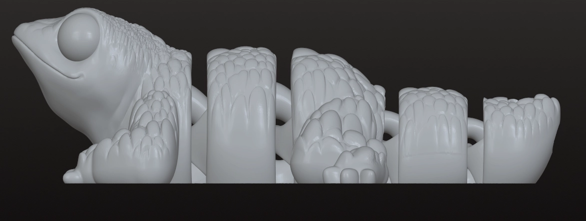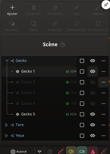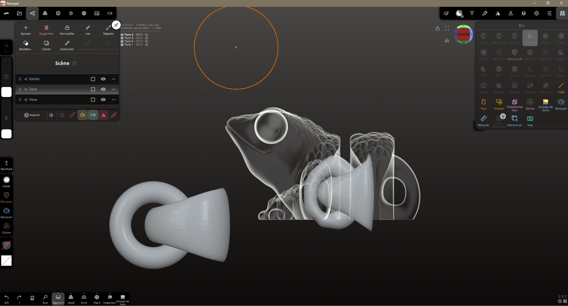 On passe à la suite. Globalement, vous avez vu les étapes. Pour ce modèle, la suite consistait à créer des surfaces avec des primitives, puis à les texturer. À la place, on change de modèle pour un modèle généré par IA, puis découpé. (Je posterai des images de l’autre modèle quand je l’aurai terminé.) Sur ce modèle, je vous montre les étapes d’un bon modèle, quelque chose qui plaît. Vous allez apprendre à garder un modèle réutilisable, modifiable à votre guise, et à organiser vos fichiers. On découpe le modèle avec un cube de 1 mm, opération booléenne. Ensuite, on fait clic droit → Séparer. On obtient ainsi plusieurs parties. Maintenant, dans l’outil Opération, on déplace nos parties de 5 mm. On ajoute le joint. On est parti sur un joint différent, un style souvent vu dans les bons modèles flexi. Ensuite, entre nos parties, on creuse l’intérieur. On ajoute nos joints. Ici, j’ai utilisé l’outil Répéteur Courbe et modifié le radius en fonction de mon modèle. Une fois terminé, on passe aux textures non destructives. On ajoute des détails, on le rend plus attractif, puis je l’imprime. On nettoie notre scène, on fait du propre. Sélection des parties voulues, on clique sur Lier, puis Séparer. Maintenant, vous avez un beau fichier. Vous pouvez toujours gérer votre scène comme vous voulez : déplacer, copier, etc. un objet. On continue. Le joint est volontairement gros. Il est fait à partir de deux tores. Le tore large est modifié avec le pinceau Déplacer, symétrie activée sur les 3 axes. J’ai oublié de faire le screen du tore, alors je l’ai refait puis mis en scène. On ajuste avec le pinceau Déplacer, encore et encore. On fait la courbe comme précédemment, on gère le radius, on met bien en place. Si vous avez des difficultés avec le Répéteur Courbe, on peut dupliquer, sélectionner et mettre en place manuellement. On gère l’échelle avec l’outil Transformer dans la boîte d’outils à droite. Et c’est fini. À ce stade, vous avez découpé un modèle et ajouté les joints. Rapide et efficace. J'ai déjà ajouter la texture mais on va la changer, vor le non destructif et faire des yeux avec l'outils masque J’ai déjà ajouté la texture, mais on va la changer. On va voir le non destructif et faire des yeux avec l’outil Masque.1 point