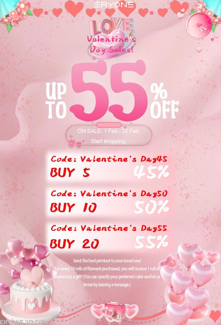 Pour ceux qui ont besoin de refaire leur stock de PLA/PETG et qui apprécient (ou veulent découvrir) les filaments Eryone, c’est le moment de faire chauffer la carte bleue. Une opération spéciale Saint-Valentin vient de tomber sur les consommables impression 3D avec jusqu’à -55 %, livraison rapide (3~8 jours) et bobines gratuites en bonus. Les codes promo Pour 5 bobines achetées, -45 % avec le code Valentine’s Day45 Pour 10 bobines achetées, -50 % avec le code Valentine’s Day50 Pour 20 bobines achetées, -55 % avec le code Valentine’s Day55 Bonus : 1 bobine offerte toutes les 10 achetées (couleur au choix sur demande) Livraison gratuite Offre valable jusqu'au 25 février2 points